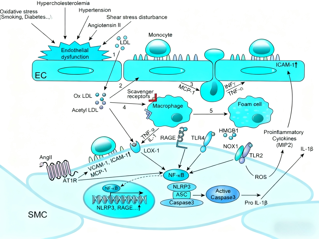 内皮功能障碍是动脉粥样硬化的始动环节。研究表明,CD36在整个主动脉内皮细胞表面广泛表达,在氧化低密度脂蛋白(ox-LDL)刺激或高脂饮食条件下其表达显著上调。CD36通过介导ox-LDL及其他修饰脂质的内吞摄取,促进脂质在内皮下空间的积累,进而引发早期动脉粥样硬化病变。