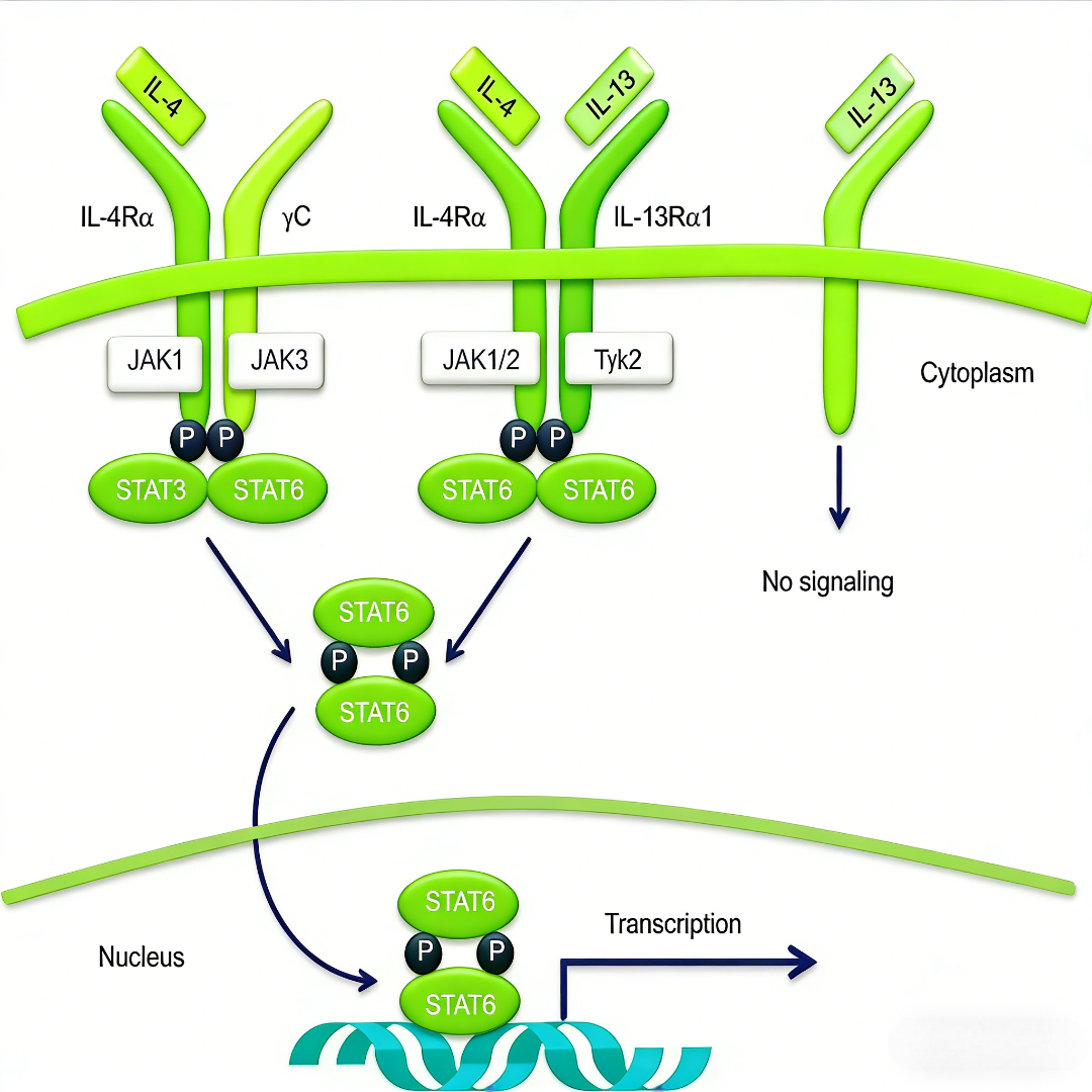 1. 阻断IL-4Rα信号:针对IL-4Rα亚基的单克隆抗体是当前最成功的策略。这类药物能同时阻断IL-4和IL-13通过I型和II型受体传递信号,从而全面抑制下游的炎症级联反应,已在多项临床试验中证明对中重度哮喘和特应性皮炎患者具有显著疗效。