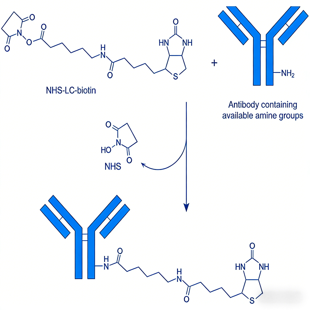 在基于抗原-抗体反应的免疫检测技术中,二抗是连接特异性一抗与可视化检测系统的重要桥梁。传统的检测方法通常将酶(如辣根过氧化物酶、碱性磷酸酶)或荧光染料直接偶联到二抗上。而生物素标记二抗策略则采用了一种模块化、间接的放大方案:首先,将生物素分子共价偶联到二抗上,制备成生物素化二抗。随后,利用预先偶联了报告分子(如酶、荧光素、胶体金)的链霉亲和素,通过其与二抗上生物素的强亲和力进行"二次结合"。这种设计带来了多重优势:信号显著放大。由于一个生物素化二抗可结合多个链霉亲和素-报告分子复合物,而一个链霉亲和素又能结合多个报告分子,从而实现了多级信号放大,极大提升了检测低丰度靶抗原的灵敏度。第二,系统高度灵活与通用。研究人员只需备有一种生物素化的二抗(如生物素化羊抗兔IgG),即可通过与不同报告分子标记的链霉亲和素搭配,轻松适配于酶联免疫吸附测定、蛋白质印迹、免疫组织化学、免疫荧光、流式细胞术等多种检测平台,无需为每种应用单独制备不同的偶联二抗,节省了成本并简化了实验流程。